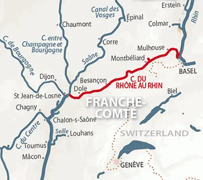 Histoire – Le premier tronçon du canal de Franche-Comté (nom d’alors) fut autorisé par le Conseil de Bourgogne en 1783 et achevé en 1802, reliant la Saône à Dôle. Napoléon souhaitait développer les voies navigables intérieures à travers le pays, et la liaison Rhône-Rhin revêtait une importance stratégique telle qu’il donna son nom au projet. Il écrivit à Crétet, directeur des Ponts et Chaussées, en 1805 : « Ce ne sont ni les palais ni les bâtiments dont l’Empire a besoin : ce sont les canaux et les rivières navigables. » D’où le nom de canal Napoléon. Le problème résidait dans le financement. L’administration impériale conçut alors un modèle précurseur des partenariats public-privé actuels, consistant à vendre des canaux existants à des entreprises privées afin de financer la construction de nouvelles liaisons. Les recettes furent réaffectées à l’effort de guerre, et ce n’est qu’avec la finalisation du programme de Becquey en 1821 que ce projet vital, rebaptisé « Canal Monsieur », put être relancé par la compagnie des canaux créée à cet effet. Les travaux furent achevés en 1833 par l’ingénieur Claude-François Perret. La mise aux normes Freycinet débuta en 1882, et le niveau du canal fut abaissé, réduisant ainsi le nombre d’écluses. Les travaux s’achevèrent en 1904. La nouvelle voie navigable à grande capacité Rhin-Rhône aurait rendu le canal obsolète, mais le ministre de l’Environnement, Dominique Voynet, annula ce projet en 1997. Le gouvernement finança alors, à titre de compensation, les travaux d’entretien et autres améliorations en retard. Le canal doit être transféré aux régions, mais aucun calendrier n’a encore été établi pour cette opération.